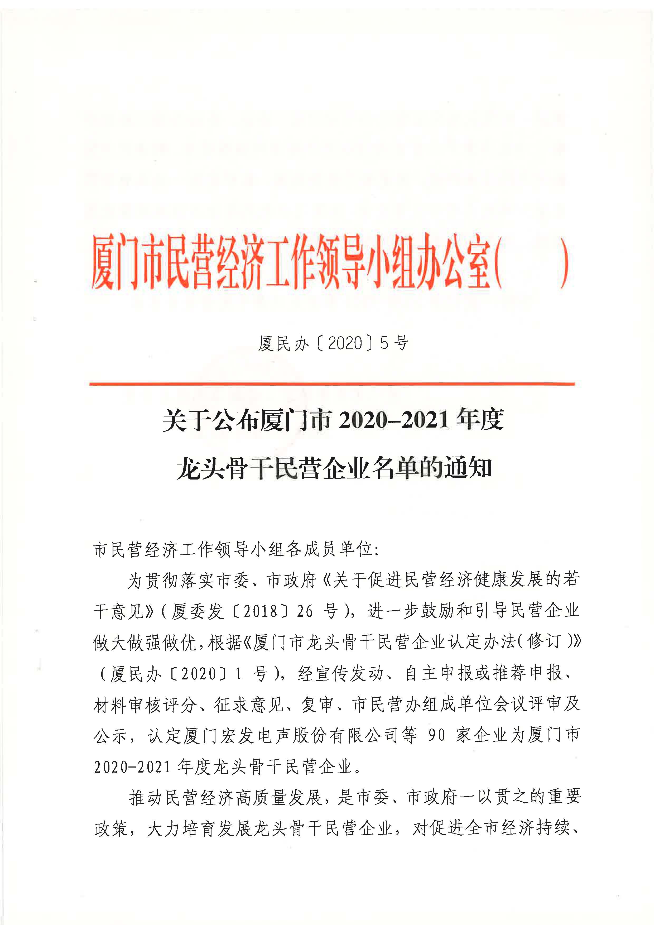 ? ? 為貫徹落實市委、市政府《關于促進民營經濟健康發展的若干意見》(廈委發[2018]26號),進一步鼓勵和引導民營企業做大做強做優,根據《廈門市龍頭骨干民營企業認定辦法(修訂)》(廈民辦[2020]1號),經宣傳發動、自主申報或推薦申報、材料審核評分、征求意見、復審、市民營辦組成單位會議評審及公示,認定廈門宏發電聲股份有限公司等90家企業為廈門市2020-2021年度龍頭骨干民營企業。