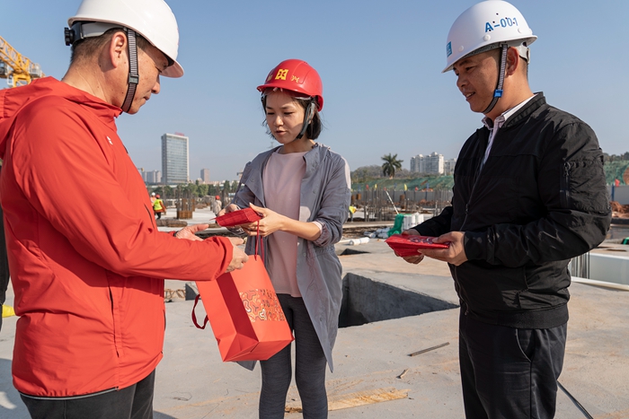 大年初三(2月14日)下午,廈門恒興集團董事長柯希平、副總裁白玉淵,廈門市恒興教育投資有限公司董事長柯嵐嵐、副總經理傅巧端等一行走訪了項目設計單位壘智設計集團和項目施工現場,為每一位堅守崗位的工作人員送上春節紅包及新春祝福。