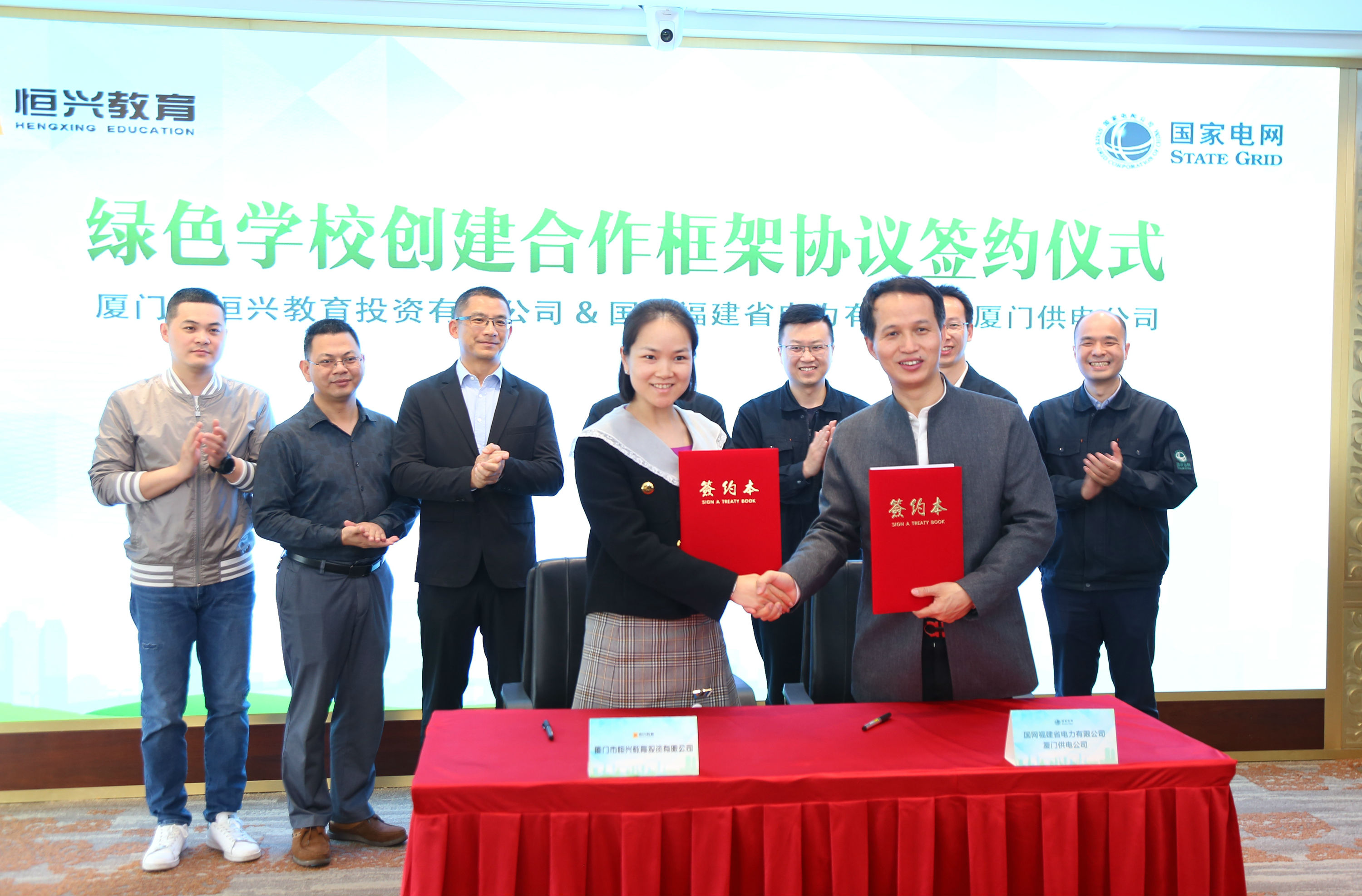 儀式上,廈門市恒興教育投資有限公司董事長(zhǎng)柯嵐嵐和國(guó)網(wǎng)廈門供電公司副總經(jīng)理許志永,代表雙方簽署了綠色學(xué)校創(chuàng)建合作框架協(xié)議。
