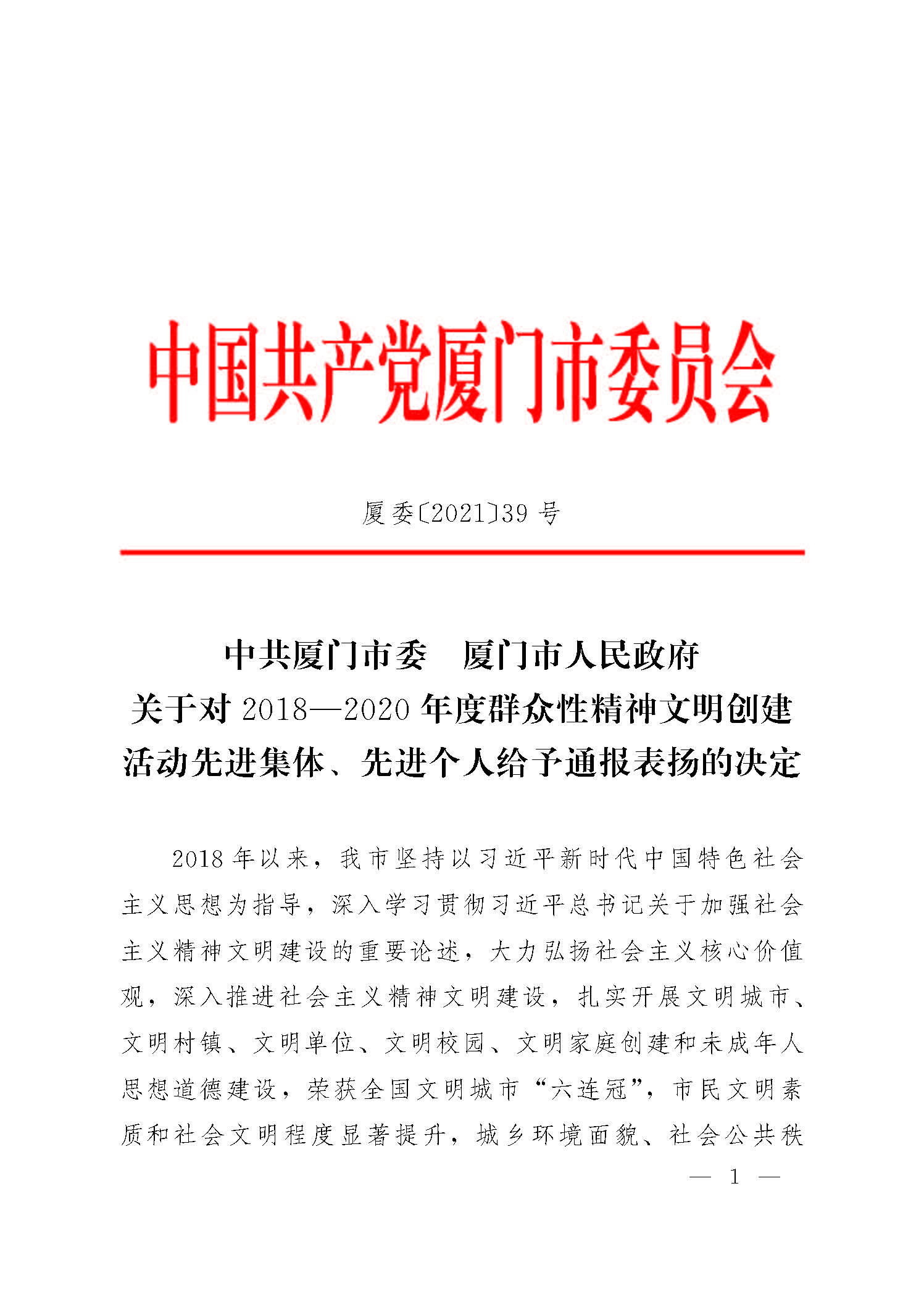 近日,中共廈門市委、廈門市人民政府發(fā)布了《關于對2018—2020年度群眾性精神文明創(chuàng)建活動先進集體、先進個人給予通報表揚的決定》,對在2018-2020年度精神文明各類創(chuàng)建活動考評推薦工作中考核達標的、表現(xiàn)突出、成效顯著的市級文明集體、個人進行通報表揚,其中,廈門恒興物業(yè)服務有限責任公司榮獲“廈門市文明單位”稱號。