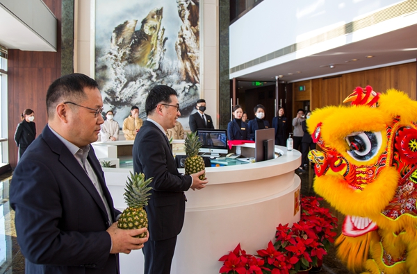鏗鏗鏘鏘的鑼鼓聲中,雙獅眨眼賣萌、登高跳躍,獻上兩顆新嫩璀璨的大鳳梨,董事副總裁王偉文、資金部總經理李蘇作為代表,欣然接福。鳳梨在閩南一帶用俚語講,便是“旺來”,作為諧音,寓意極好。